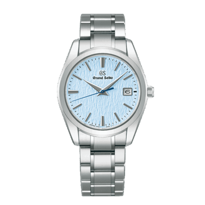 グランドセイコーの機械式モデルの製造元「グランドセイコースタジオ 雫石」から望む岩手山で厳冬期に見られる「氷瀑」をイメージ。その幻想的な光景を、ダイナミックさと繊細さが共存したパターンを施したアイスブルーのダイヤルで表現されています。