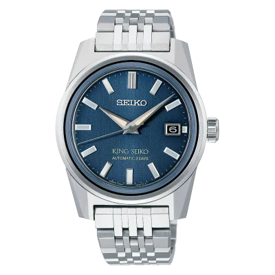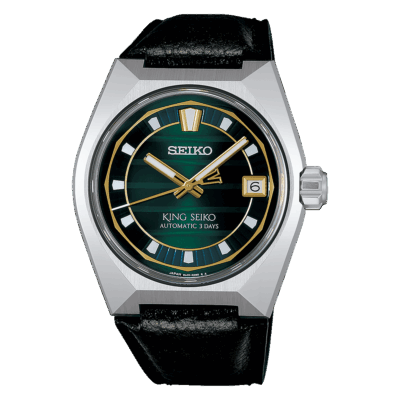 大胆な多面カットが施されたエッジの際立つケースデザインが特徴であるキングセイコーKSKシリーズに、光をイメージした型打ち文様を施したブラックカラーのダイヤルを採用されています。